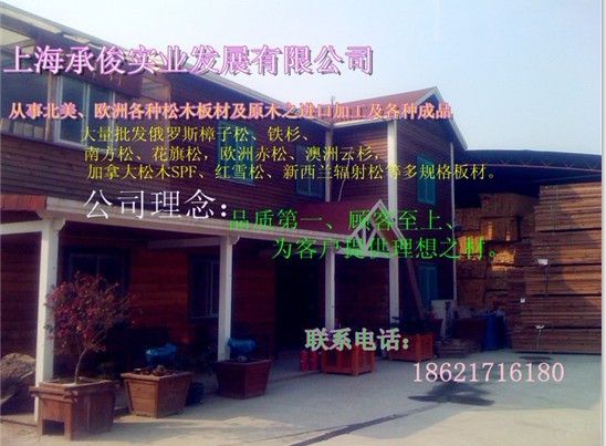| 上海承俊實業發展有限公司成立于2008年,經過幾年的不斷發展倉庫面積占地30000M2.專業從事北美、歐洲各種松木板材及原木之進口加工及各種成品,大量批發俄羅斯樟子松、鐵杉、南方松、花旗松,歐洲赤松、澳洲云杉,加拿大松木SPF、紅雪松、新西蘭輻射松等多規格板材。《另有倉庫,太倉港,龍吳港》 供應國內眾多大型家具沙發木制品企業,木門材料、包裝材料,防腐材料,園林綠化公司及木材貿易企業公司的長期穩定供應商。 另及市場大量需求并開發木材防腐部門:專業從事防腐木生產、銷售;戶外木結構景觀設施;大型木結構建筑及高檔住宅戶外的木裝飾、木制品的設計、小區景觀、木結構獨立式住宅、(別墅)制作。 公司理念:品質第一、顧客至上、為客戶提供理想之材。 |
